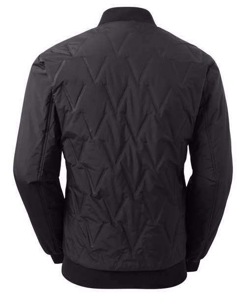 Tonal fashion coil zip on centre front with signature zip puller. Front & Back panels to be insulated with moulded vector shaped pattern. Insulated plain sleeves. 100gsm lightweight polyester fill. Fully-lined in tonal polyester. Bomber style collar. Welt pockets with rubberised stud opening, striped grosgrain trim with rectangular eyelet. Tonal elasticated cuffs and hem. Internal double jet zipped pocket. Internal zipped opening for embroidery access. Product contains no branded neck label.* Removable Kimble or looped garment tags. Inner seam label holds important product information on one label with a second label containing brand information which can be cut-away.